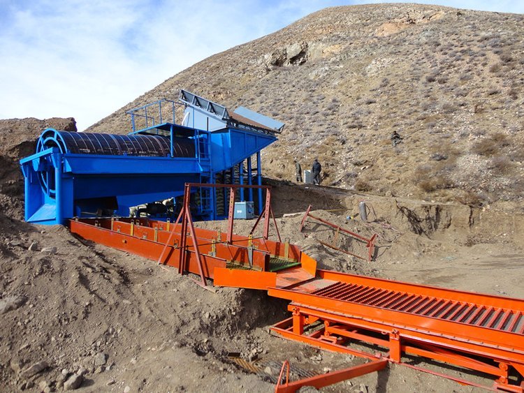 1、2工作流程:挖掘斗由电机驱动实现挖掘上料,卵石经过滚筒筛选滑排河中,小型石和含矿沙混合物通过注水滑沙板进入磁选机进入除铁流程,磁铁粉在高磁环境中被提取进入专用收集舱内,剩余矿砂自磁选设备底部进入两条固定溜槽,在高流速水的作用下形成旋流提取大颗粒沙金,剩余矿料流入两台水套离心机进行精选,精料收集每2-3小时一次。本流程从挖掘、筛选、除铁、粗选到精选工艺简单实用,人力、电力消耗低,黄金提取率高。