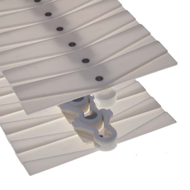 零间距1765龙骨铰链拥有设计的顶板。当该款链条在转弯轨道或链轮上运动时,链条表面始终保持封闭状态。