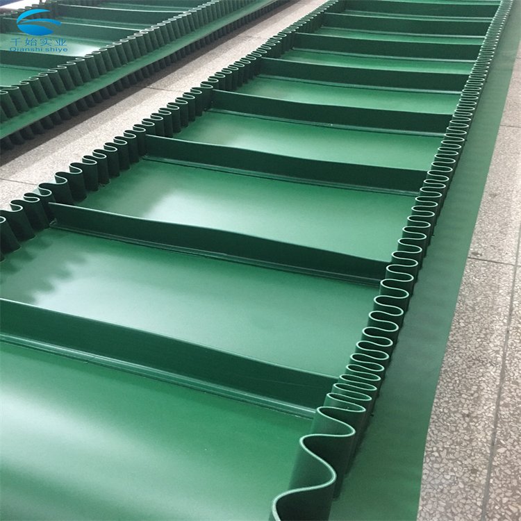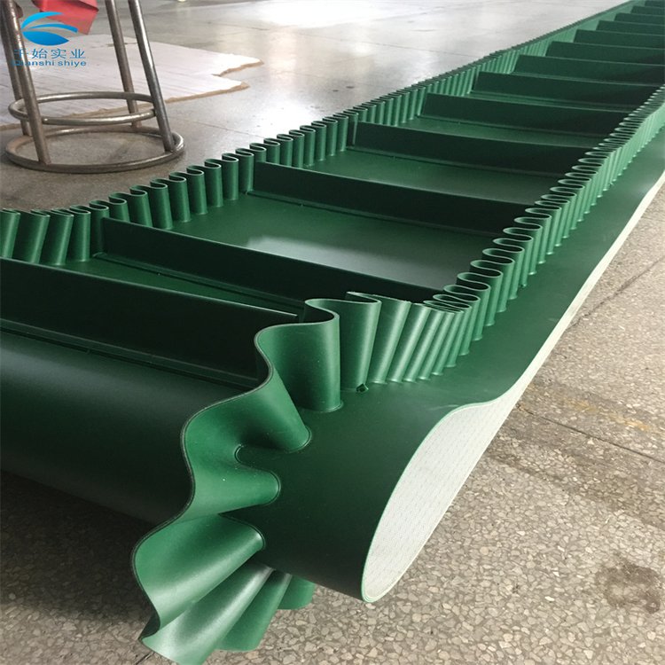 裙边输送带分为:有裙边无隔板输送带和有裙边有隔板输送带两种。能使各种散装物料以0-90度作任意倾角连续输送、具有输送倾角大、使用范围广、占地面积小。无转运点、减少土建投资、维护费用低、输送量大等特点,解决了普通输送带或花纹输送带所不能达到的输送角度。波状挡边输送带可根据要求设计成一套完整输送系统,避免了间断输送和复杂输送的提升系统。