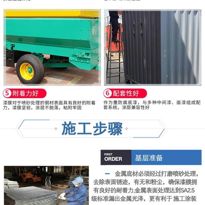 该产品防腐性优异、机械性能好、附著力强,具有导电性和阴极保护作用。一道成膜在75um以上,可用作车间预涂底漆。其厚膜在15-25um时进行焊接,不影响焊接性能,此产品也可作为各种管材、煤气柜的防锈底漆使用。