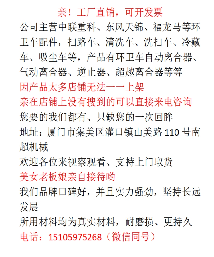 主营产品:厂家直销,中联、福龙马、宇通、南京晨光、天路通、湖北程力、森源重工、上海神舟、烟台海德、河北肥乡远达等各大环卫车厂家的环卫车离合器。