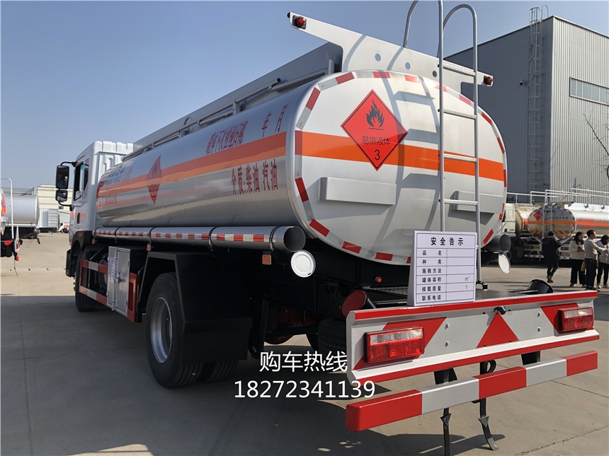 当然一台期间配置的大卡车,工具箱是少不了的,还有铝合金折叠护栏,罐尾一部爬梯,罐体两周分别贴一张反光板,一个防火帽,两根与罐体长度相当长的输油管,两个灭火器更是神助攻,罐体涂有防锈漆,一般用个3-5年不会生锈的,贴有3M国际大牌反光条,反光带,还有安全告示,三个依然液体标,让您上路更加的安全。