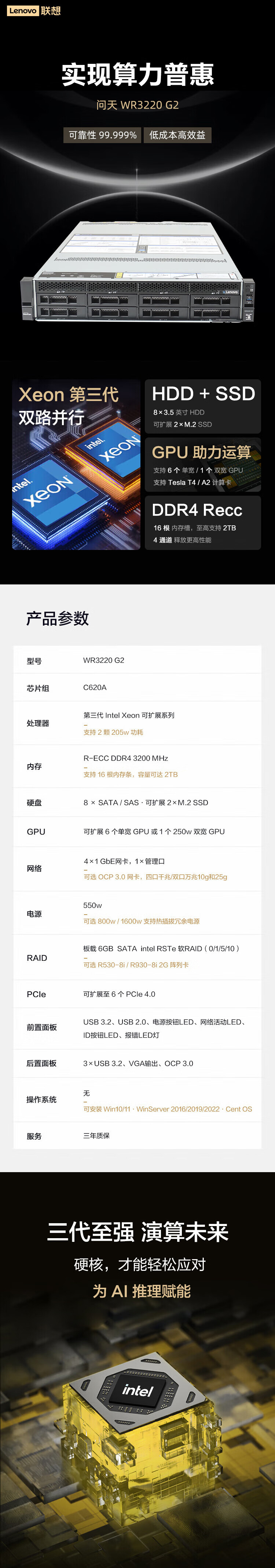 联想问天WR3220 G2 2U机架服务器 银牌4310/32G/2*2T 办公OA 数据库 CPU | 银牌4310 | ||