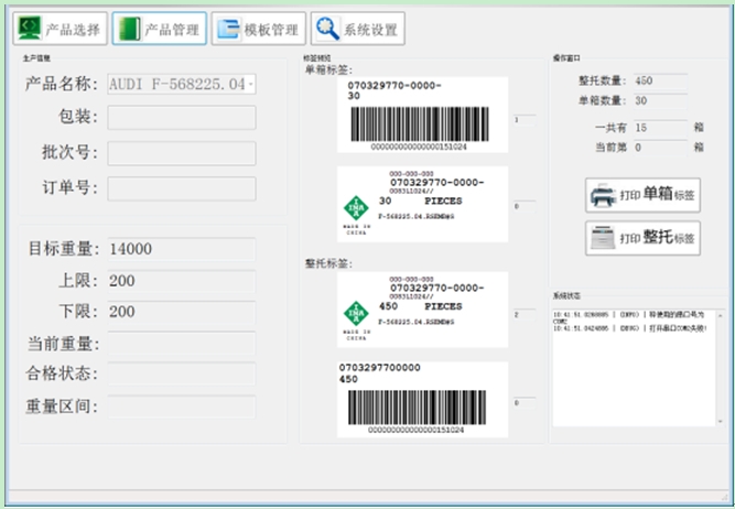 4. 把组装或包装好的产品放在称上,按手动开关触发系统根据设置的值,自动判断是否产品是否合格,如果合格,控制斑马ZM400打印出产品对应的标签,当产品数量够整托时,可以自动打印整托标签.如果结束生产时数量没够整托,也可手动打印整托标签(数量以当前生产产品数量为准).如果当前产品不合格,系统通过IND560的DI/DO板向报警电路给出报警信号.这时将不打印标签.