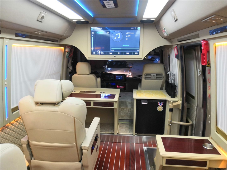 丰田考斯特车身长度为7.005米,身宽度为2.040米,车身高度为2.774米,高大的车身为我们提供了宽敞舒适大的乘驾空间,华通丰业新款丰田考斯特整车的一体式多媒体影视系统,构建10.2多声道环绕音响系统,并搭载了欧美版星光顶,给您带来了不同寻常的舒适体验。丰田考斯特12座改装商务车还可以安装原装进口的埃尔法座椅,配备有通风加热以及电动脚托的设计,为我们的旅行提供更加舒适的乘车环境。丰华通丰业田考斯特12座在内饰的窗帘以及地毯的设计上也有很多独特的设计。豪华的布艺窗帘和舒适的通道地毯想结合,展现出一种尊贵之感,百褶窗帘和豪华的游艇木地毯相互衬托,展现出丰田考斯特12座的独特大方和舒适。