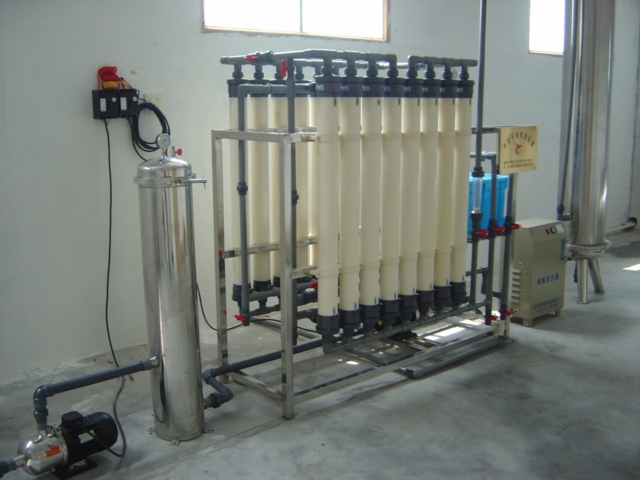 ? ?超滤设备:超滤可过滤20~1000埃(小于0.1μm)大小颗粒.超滤膜可去除水中的微料、胶体、蛋白质、微生污染物及大有机物,而透过所有溶盐及较小的分子。大多数超滤膜可分离相对分子质量介于1000~100000之间的物质。透膜压一般为1~7bar(15~100psi)。