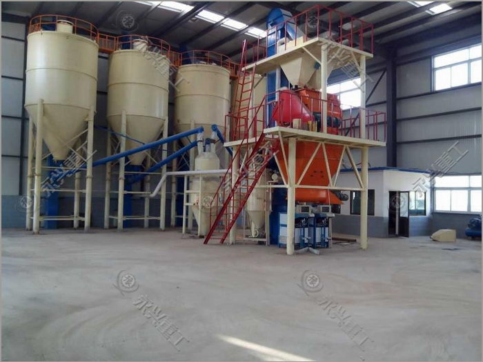 干混砂浆生产线系列设备主要是由提升机、预混仓、小料仓、混合机、成品仓、包装机、除尘器、电控柜、气相平衡系统组成。水泥等大比例原料可通过人工计量经过提升机进入预混仓,纤维素、胶粉等小比例贵重母料可通过电子秤计量投入外加剂料斗,与简易型相比又先进一步因为混合机混合之后通过阀口袋包装机或者敞口袋包装机自动计量包装。干粉砂浆搅拌机主要搅拌物料是:干粉砂浆搅拌机设备能够满足不同性能要求的干粉砂浆、干粉物料、干粉粘合剂等的生产需要,如:腻子粉、干粉涂料、砌筑砂浆、抹灰砂浆、保温系统所需砂浆、装饰砂浆等各种干粉砂浆。