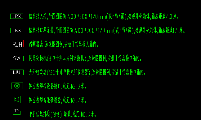 (2) 信息接口单元箱安装在各个防护单元的指挥通信值班室内,箱体材质为金属外壳,外形尺寸不小于400mm×300mm×120mm,安装方式可墙挂或内嵌,距地面1.5m,内置防空袭报警信息接收显示控制设备、网络交换机、光纤收发器等数据转换与传输设备;