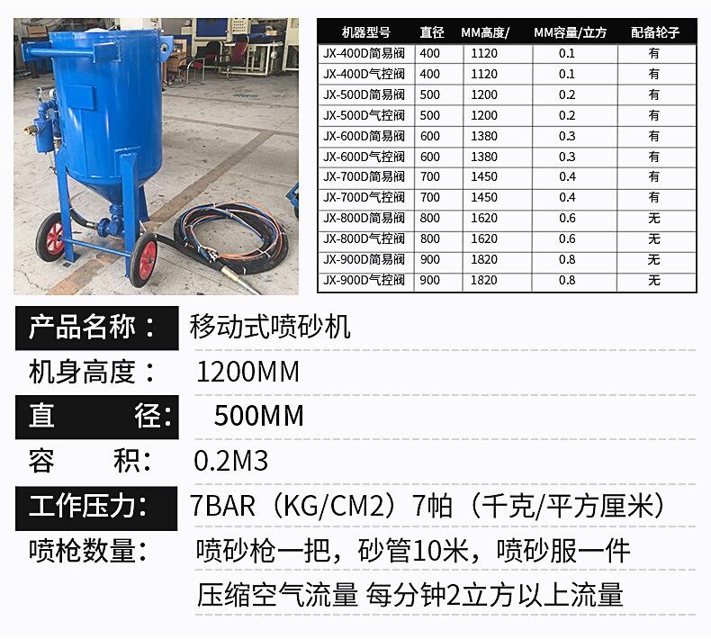 喷砂机由砂罐、砂阀、喷砂管、喷砂枪等部分组成。是以压缩空气为动力,将磨料(砂、铁砂、铜矿砂等)喷射到需要处理的工作表面的设备。压缩空气将磨料从沙罐中压出,经过砂阀和喷砂管到喷枪,磨料以大于200米/秒的速度喷出,由于末了对物体表面的冲击和切削 完成金属表面除锈、去氧化皮、旧漆皮和污垢的作用,并获得一定的清洁度和粗糙度 ,可达sa2.5-sa3.0的标准。对压缩空气压力磨料目数的调整变化,也可以用于建筑物,道路除垢、混凝土除垢、玻璃毛化等方面。