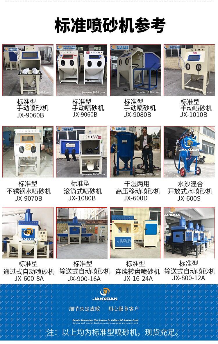 吉轩公司专业生产的喷砂机类别有:手动喷砂机,输送式自动喷砂机,湿喷砂机,干喷砂机,移动喷砂机,箱式喷砂机,转盘式自动喷砂机,全自动喷砂房等不同型号。产品应用于诸多加工领域,表面加工;表面美化加工;蚀刻加工;前处理加工;毛边祛除;硬化处理和大型结构件加工,能够满足顾客的不同需要。